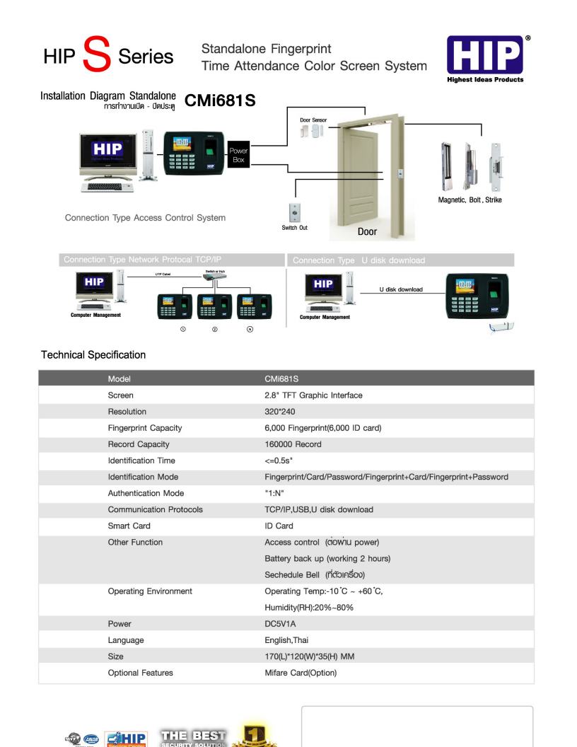 CMi681s เครื่องสแกนลายนิ้วมือ รุ่นใหม่ของทาง HIP มาพร้อมไอค่อนเมนูภาษาไทยแบบเดียวกับสมาร์ทโฟน มีเสียงตอบรับเมือสแกน เช่น บันทึกสำเร็จค่ะ เข้างานได้ค่ะ ลองใหม่อีกครั้งค่ะ ช่วยให้ไม่พลาดทุกครั้งที่มีการสแกน หน้าจอสีกว้าง 2.8 นิ้ว ดีไซด์สวยงาม รองรับการเชื่อมต่อแบบเครือข่าย (TCP/IP) ได้อย่างสมบูรณ์แบบ หัวอ่านแบบกระจกป้องกันการขีดข่วน รองรับลายนิ้วมือได้ถึง 6,000 ลายนิ้วมือ 160,000 รายการบันทึก พร้อมรองรับการทาบบัตร Proximity Card รองรับการดึงข้อมูลด้วย USB Flash Drive และผ่านสาย USB Data Link เหมาะสำหรับองค์กรทั้งขนาดเล็ก ขนาดกลาง สามารถตั้งกะการทำงาน สรุปเวลาทำงาน ขาด ลา มาสาย โอที ทำงานเป็นกะ และกำหนดวันหยุดประจำปีได้ ช่วยให้วางแผนการทำงานล่วงเวลาได้ตามต้องการ คุณสมบัติของ เครื่องสแกนลายนิ้วมือ CMI681s - จอสี TFT ขนาด 2.8 นิ้ว - ความละเอียดของหน้าจอ 320*240 - บันทึกข้อมูลได้ทั้ง ลายนิ้วมือ บัตรและรหัสผ่าน - รองรับ 6,000 ลายนิ้วมือ - เก็บข้อมูลได้ 160,000 รายการ - ระยะเวลาในการประมวลผลภายใน 1 วินาที - โหมดการตรวจสอบ ลายนิ้วมือ /บัตร /รหัสผ่าน - รองรับการเชื่อมต่อผ่าน TCP/IP, USB Flash Drive, USB Data Link - เมนูไอคอน ภาษาไทย/อังกฤษ พร้อมเสียงตอบรับภาษาไทย/อังกฤษ - ใช้งานร่วมกับโปรแกรมคำนวณเวลา Premium Time สรุปเวลาทำงาน ขาด ลา มาสาย โอที และรองรับการทำงานเป็นกะ และกะข้ามวัน เป็นต้น - รองรับการเชื่อมต่อกับโปรแกรมเงินเดือน PayRoll ด้วยรูปแบบ Text File หรือ Excel - โอนข้อมูลออก Excel ได้ทุกรายงาน - มีแบตเตอรี่แบคอัพในตัว - รองรับการใช้งานต่างสาขา เชื่อมต่อแบบ online ผ่านระบบ host (option) สินค้ารับประกัน 2 ปี 1.เมื่อสมัครมาชิก 2.ร่วมกิจกรรมกดLink ที่