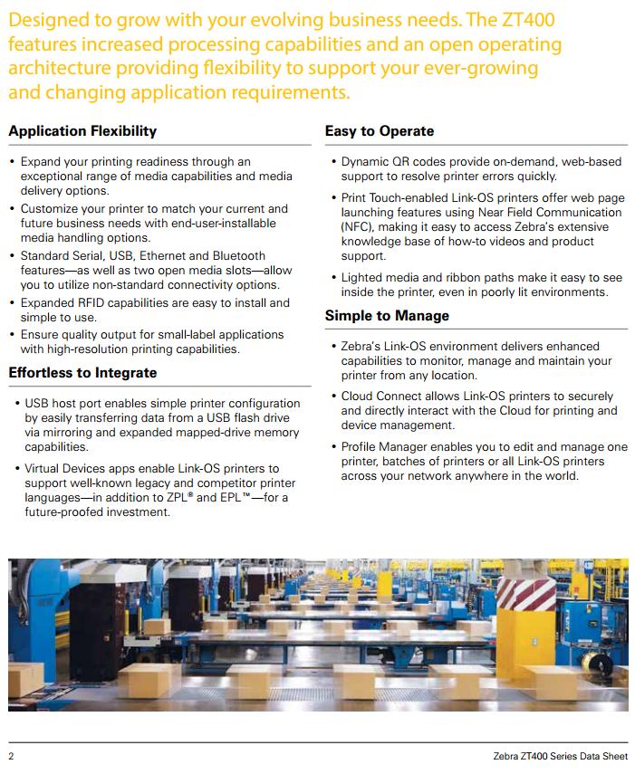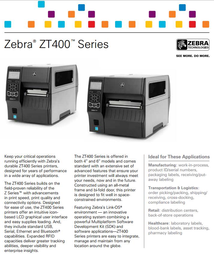 เครื่องพิมพ์บาร์โค้ด Zebra ZT400 Series รุ่น ZT410Barcode Printer Zebra ZT400 Series RFID เครื่องพิมพ์บาร์โค้ด ยี่ห้อ zebra รุ่น ZT410 มีความละเอียดหัวพิมพ์ให้เลือกทั้ง 203dpi , 300dpi และ 600dpi เครื่องพิมพ์บาร์โค้ดสำหรับงานอุตสาหกรรม ตัวถังและฝาครอบเป็นโลหะ ความทนทานสูง หน้าจอแสดงผลแบบแอลซีดี รองรับการเชื่อมต่่อ USB,RS-232, Ethernet and Bluetooth รองรับ RFID(ออฟชั่น)