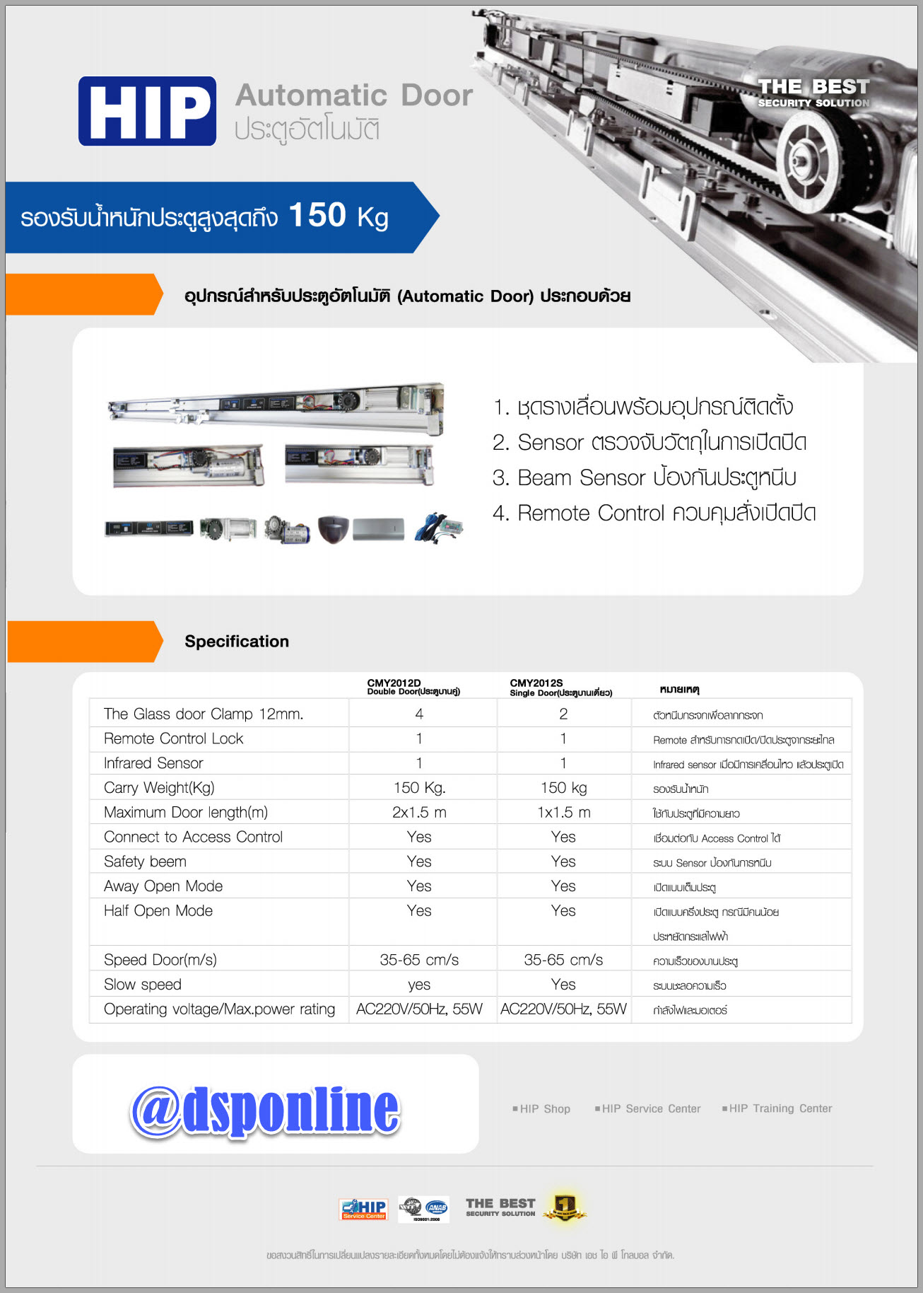 รายละเอียดสินค้า รองรับน้ำหนักประตูรวม 150kg เสียงเงียบขณะทำงาน ขนาดเล็กเหมาะสำหรับการใช้งานประตูขนาดกลาง รองรับการเชื่อมต่อระบบAccess Control มีอุปกรณ์เสริมความปลอดภัยได้แก่Safety Beam Sensor , Sensorและอื่นๆ Automatic Door CMY2012D = 1 *** ทำงาน Stanalone ได้