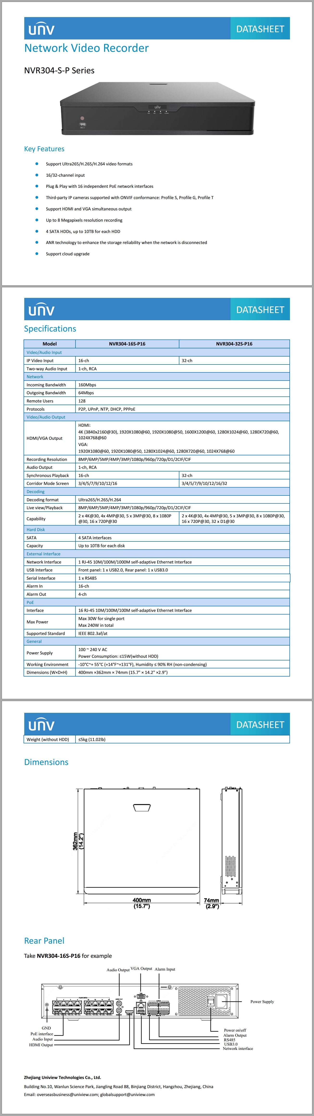 NVR304-S-P Series 16/32 Channel 4 HDD NVR รองรับรูปแบบวิดีโอ Ultra265/H.265/H.264 อินพุต 16/32 ช่อง Plug & Play พร้อมอินเทอร์เฟซเครือข่าย PoE อิสระ 16 ช่อง กล้อง IP ของบริษัทอื่นที่รองรับความสอดคล้อง ONVIF: Profile S, Profile G, Profile T รองรับเอาต์พุต HDMI และ VGA พร้อมกัน บันทึกความละเอียดสูงสุด 8 ล้านพิกเซล 4 SATA HDD สูงสุด 10TB สำหรับแต่ละ HDD เทคโนโลยี ANR เพื่อเพิ่มความน่าเชื่อถือในการจัดเก็บข้อมูลเมื่อเครือข่ายถูกตัดการเชื่อมต่อ รองรับการอัปเกรดระบบคลาวด์ รับประกัน 3 ปี
