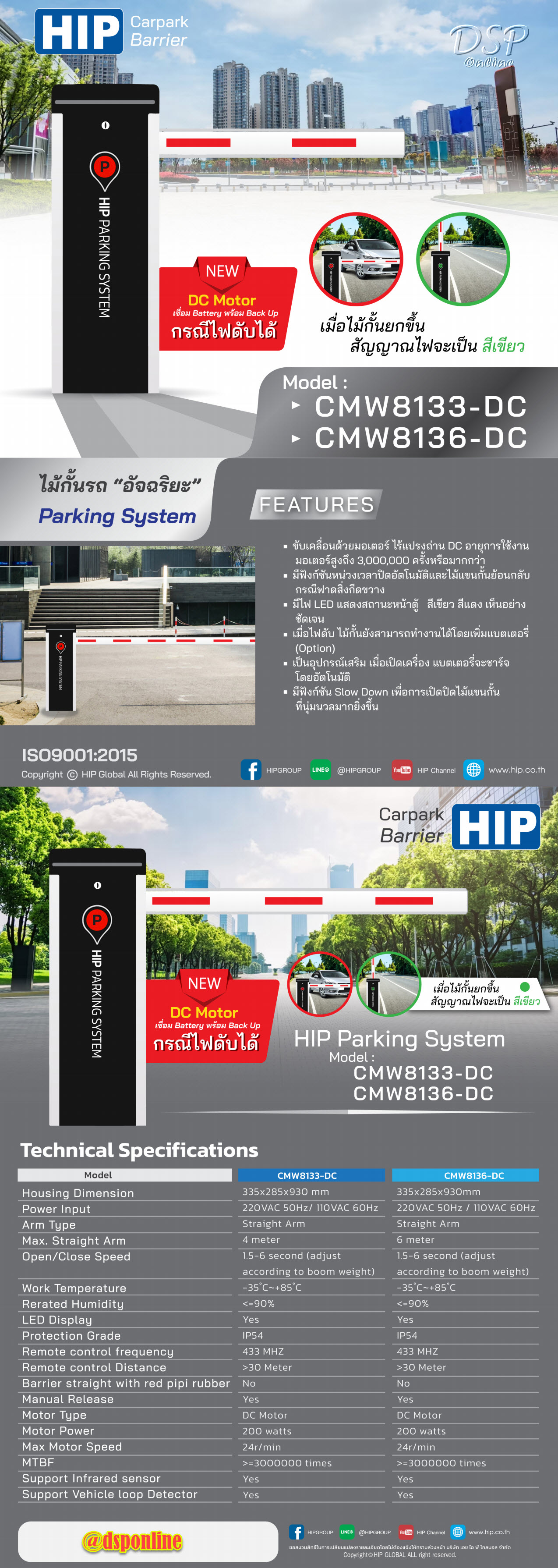 HIP Car Park Barrier รุ่น CMW8133-DC, CMW8136-DC• ขับเคลื่อนด้วยมอเตอร์ ไร้แปรงถ่าน DC อายุการใช้งานมอเตอร์สูงถึง 3,000,000 ครั้งหรือมากกว่า