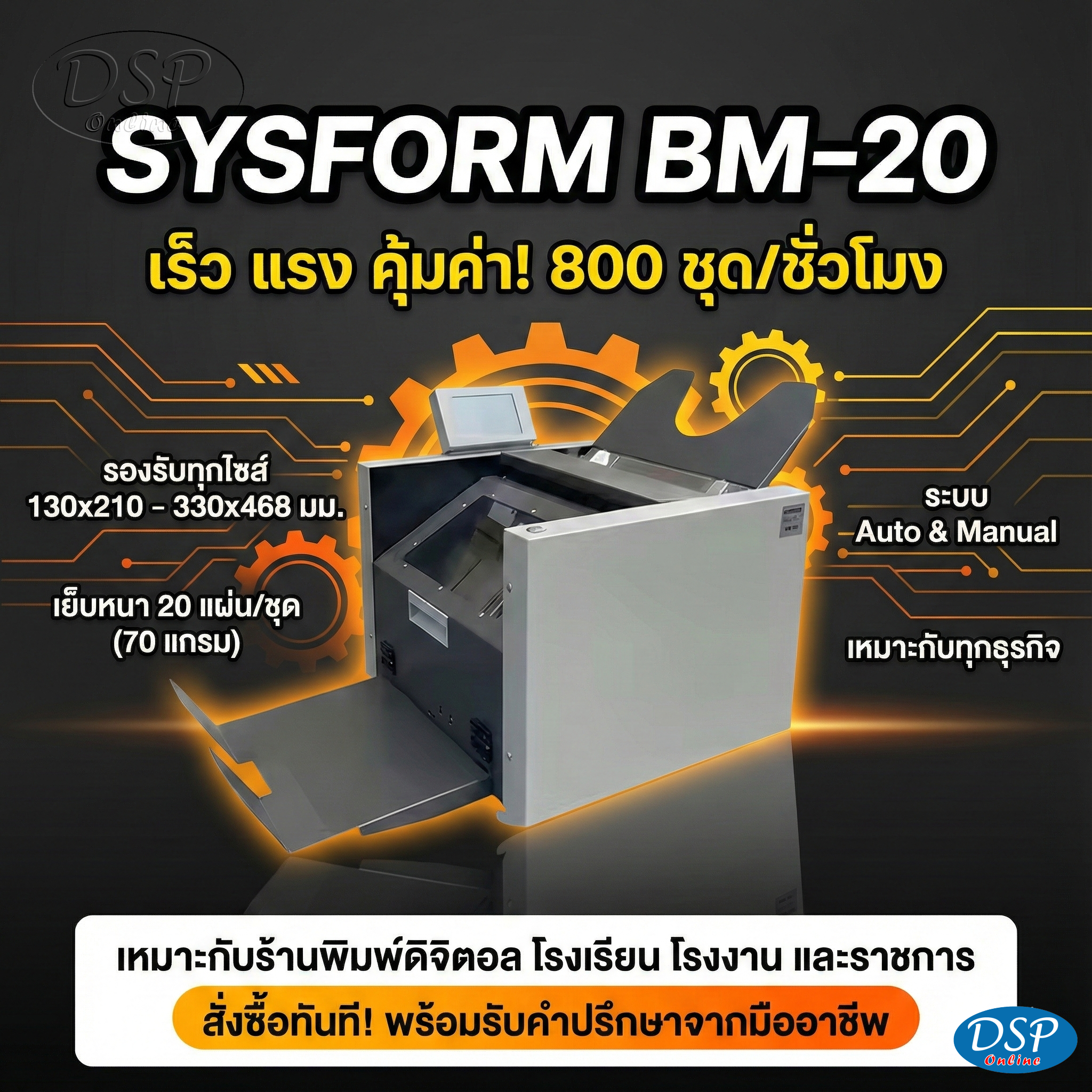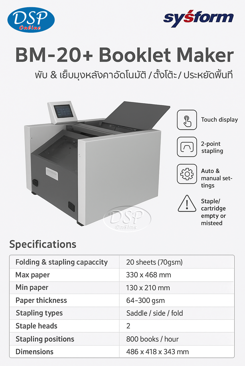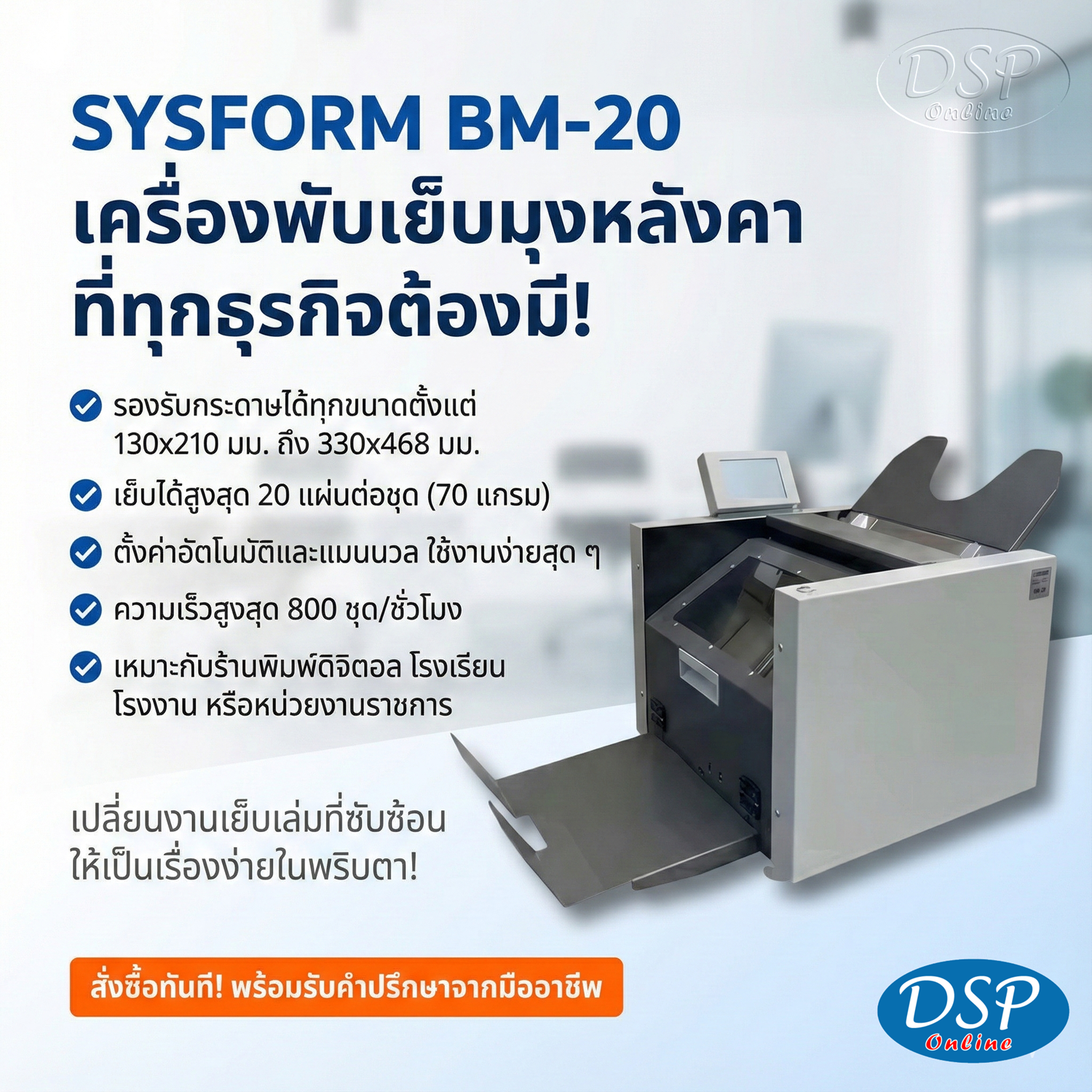 ขายถูก SYSFORM BM-20: เครื่องพับเย็บมุงหลังคาตั้งโต๊ะ รวดเร็ว แม่นยำ และประหยัดพื้นที่ SYSFORM BM-20 เครื่องพับเย็บมุงหลังคา Booklet Maker เครื่องทำสมุดเล่มเล็ก เครื่องเย็บเล่มอัตโนมัติ เครื่องเข้าเล่มมุงหลังคา เครื่องเย็บพับกระดาษ เครื่องเย็บแคตตาล็อก เครื่องเย็บเอกสาร เครื่องเข้าเล่มตั้งโต๊ะ อุปกรณ์สำนักงาน งานพิมพ์หลังการพิมพ์ DSP เครื่องเย็บอัตโนมัติ